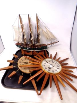 A tray of two teak sunburst wall clocks together with a model of a galleon