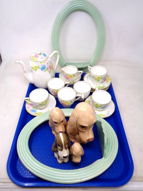A tray containing a fifteen piece Kent china tea service, Sylvac dogs, pair of English pottery oval wall shelves.