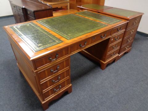 A yew wood nine drawer twin pedestal desk with three tooled leather panels