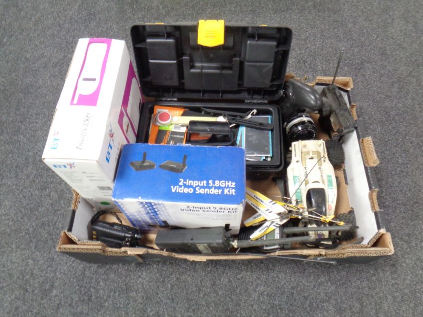 A box of assorted home phones, remote controlled helicopter and car, CB radio and walkie talkie