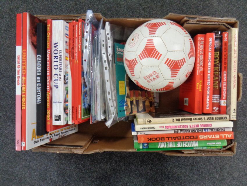 A box of signed football by Manchester United, quantity of books and football programmes relating to Manchester United.