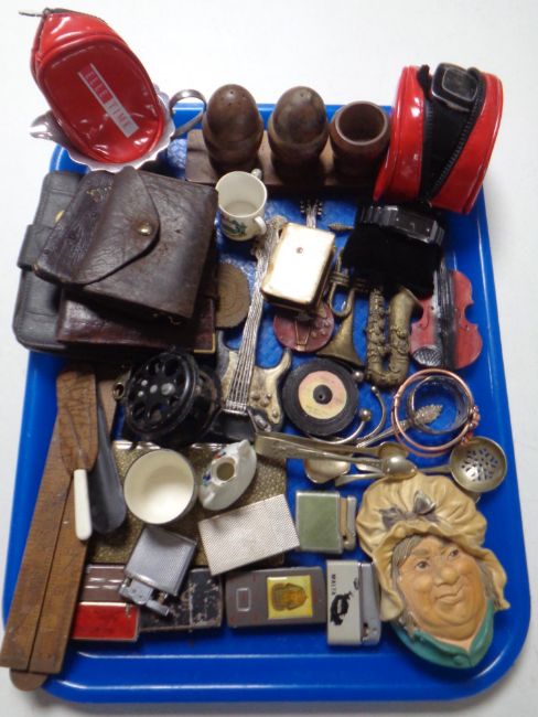 A tray of leather purses, folding wooden rule, matchbox holder, lighters, treen cruet set, watches etc