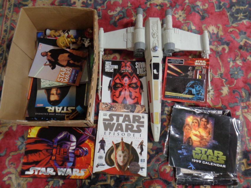 A box of Star Wars memorabilia including Episode I school pack, books, activity books and plastic toys, oversized X-wing etc