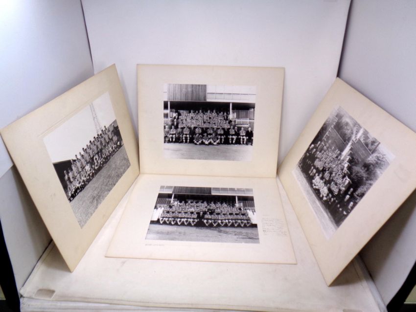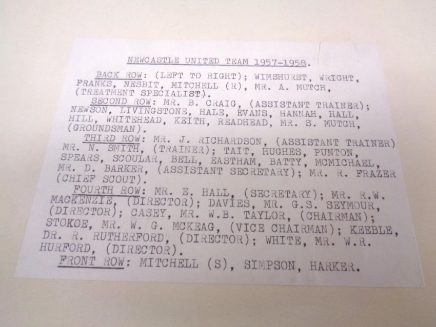 10 monochrome Newcastle United team photographs, late 1950's early 1960's in mounts. Copyright owned by the Evening Chronicle. Stamped verso with player names.
