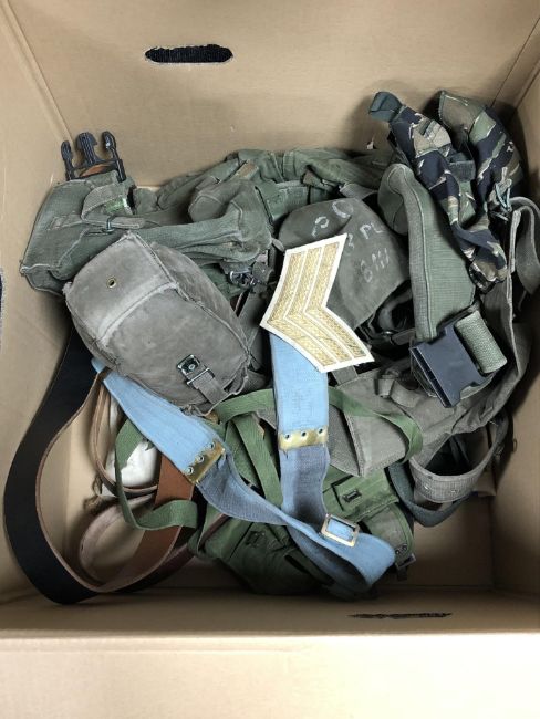 A rail of Second World War and later military uniforms comprising combat smock, British Sergeant's tunic marked Scot's Guards, British No. II army dress tunic, US Army tunic with Airborne shoulder badge, etc, together with a box of military belts, webbing, rank chevrons etc