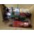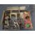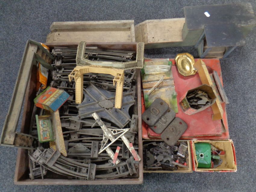 A box and a wooden tray containing vintage Hornby tin plate railway track, buildings, accessories, wooden stations, hand painted lead figures, together with three cast iron plates