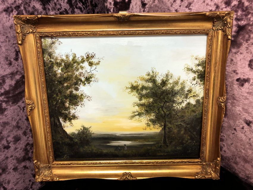 An oil on board depicting a landscape with two figures, signed with initials and dated '22, 29 cm x 24 cm, framed.