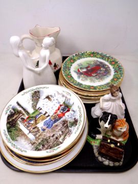 A tray of Royal Albert Christmas plates, Coalport Moments figure, Royal Doulton figure Amanda, Masons jug etc