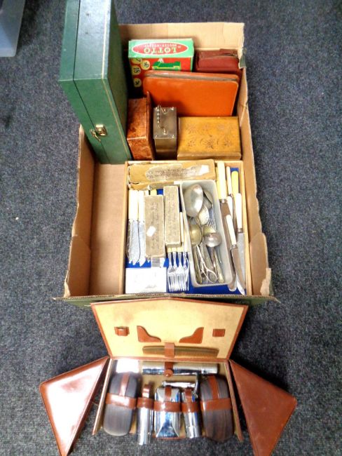 A box containing antique and later boxer and box cutlery, jewellery boxes, games, vintage gent's travel set.