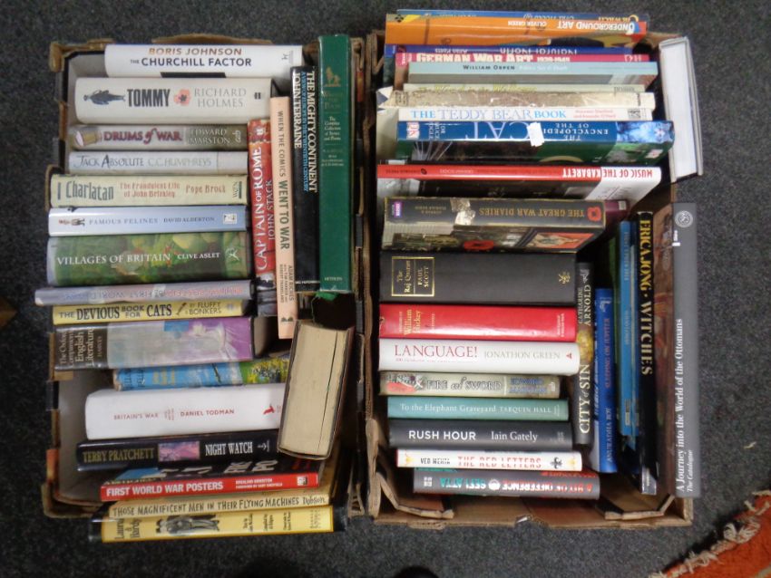 Two boxes of books relating to warfare, novels, Laurel and Hardy etc