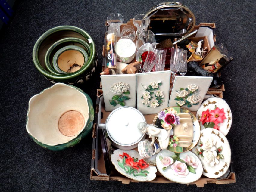 Two boxes of wall plaques, glass ware, figures, animal ornaments, pottery plant pots etc