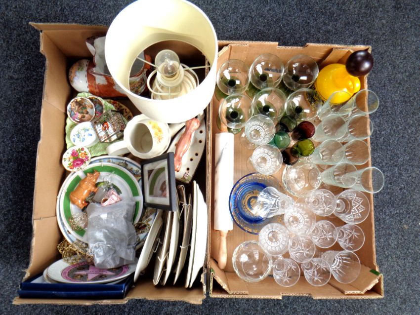 Two boxes of 20th century glass ware, pottery table lamp, collector's plates, pin dishes, copper plaque etc