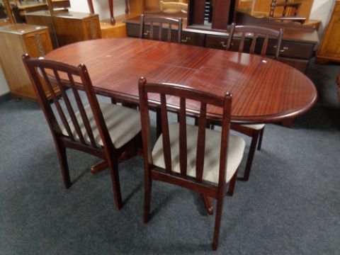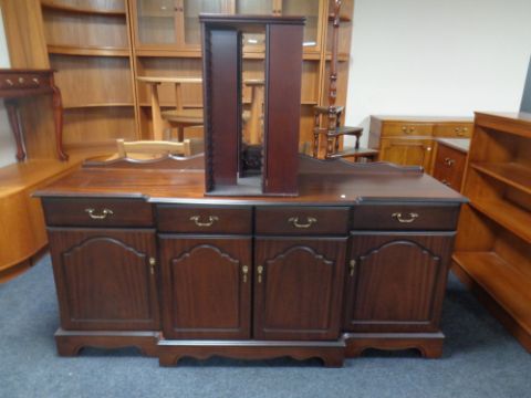 A break fronted sideboard in mahogany finish together with similar dining table and four chairs, media storage unit.