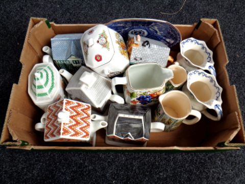 A box of collector's teapots, Ringtons blue and white plate, Ringtons willow pattern jugs