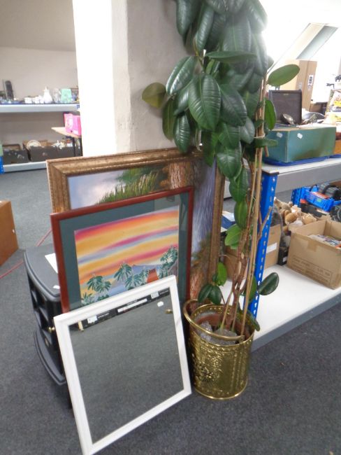 A plant in brass embossed coal bucket together with a dressing table mirror and two framed pictures
