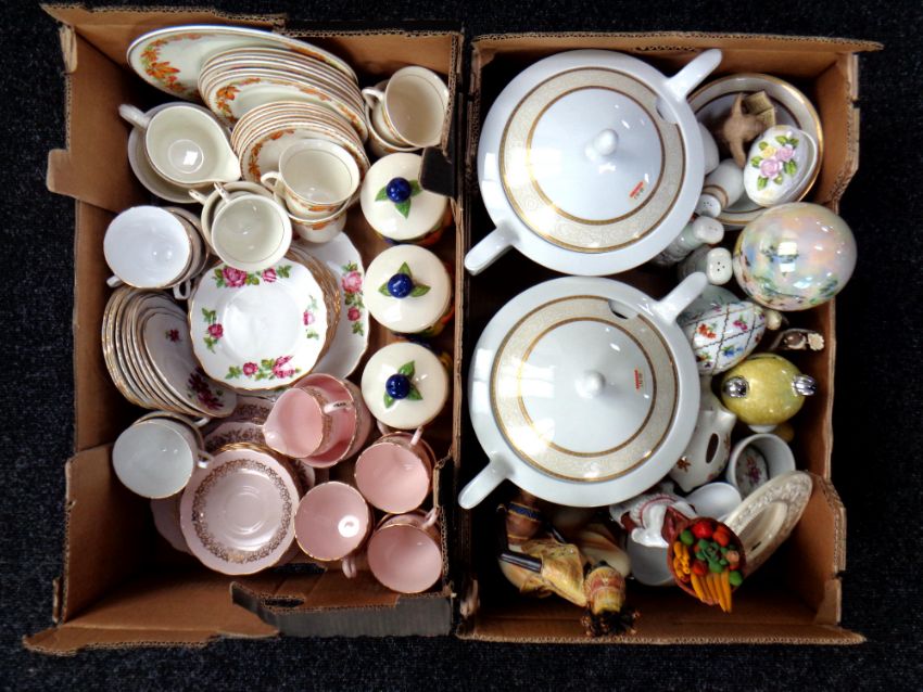 Two boxes of gilt porcelain tureens, part tea sets including Royal Vale etc