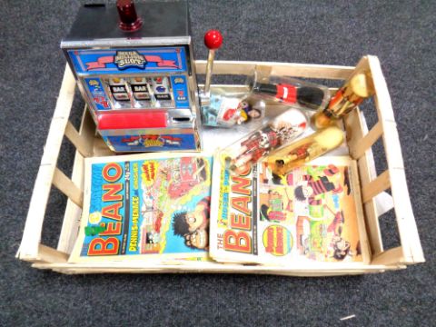 A box of Teamsters racing set, Beano annuals, figures etc, boxed Cannon printer