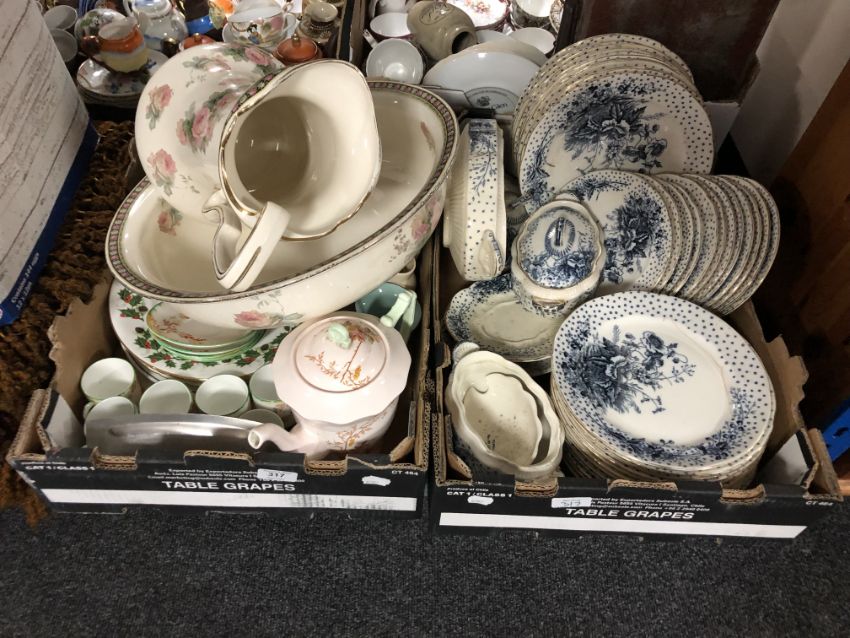 Two boxes of 19th and 20th century ceramics including S H and Sons poppy dinner ware, 19th century wash jug and basin, tea china, teapot etc