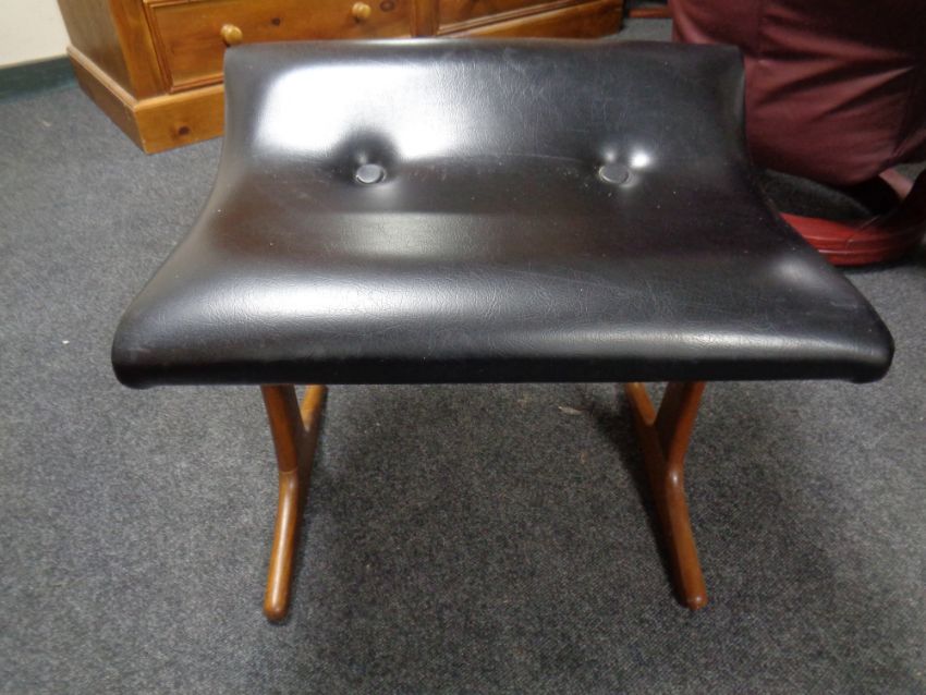 A mid century teak and black vinyl dressing table stool