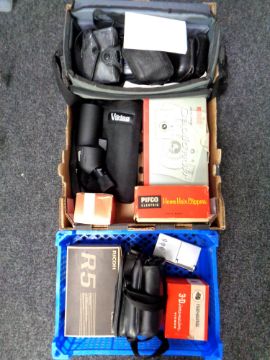 A box and crate of assorted cameras, camera bags, hair clippers, Viewmaster, a Viking spotting-scope in bag.