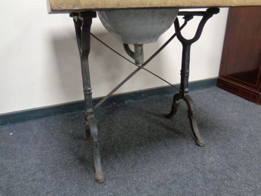 A reclaimed pine sink unit with antique ceramic sink on a cast iron base
