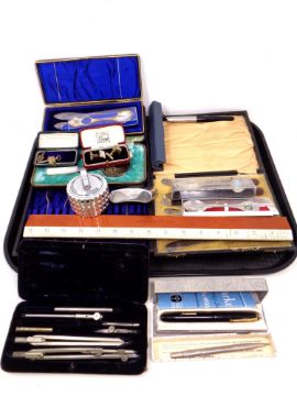 A tray of rulers, hip flask, Colibri lighter, boxed cutlery, pens etc