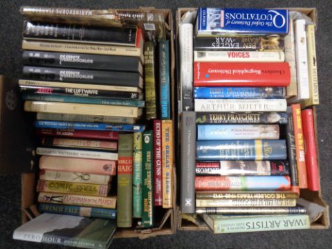 Two boxes of books relating to warfare, guns, novels, Terry Pratchett etc