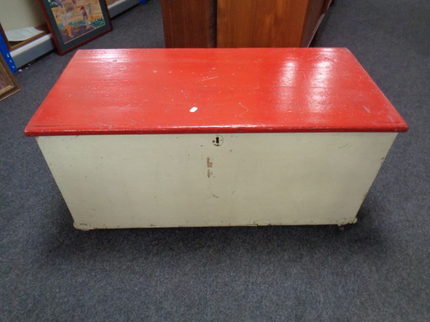 An antique painted pine blanket box