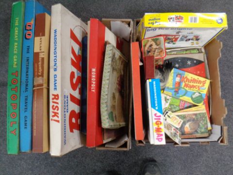 Two boxes of vintage board games, jigsaws, tea cards etc