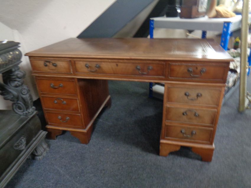 A mahogany twin pedestal writing desk fitted with nine drawers and tooled brown leather insert