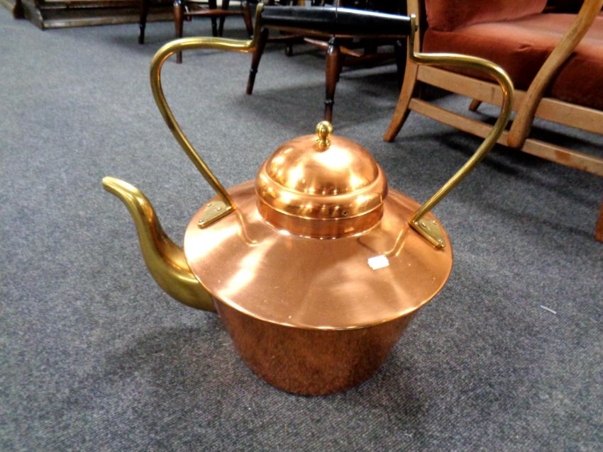 An oversized copper and brass kettle