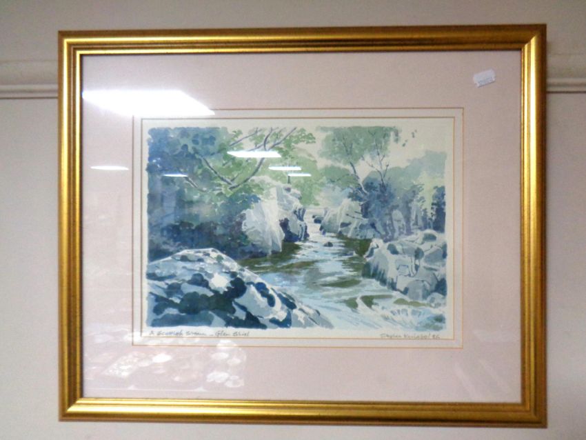 Two Stephen Knight watercolours - Rowlands Gill and Scottish stream, 36 cm x 25 cm.