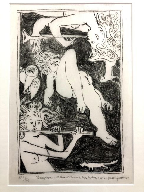 Eric James Mellon (British, 1925-2014) Persephone Returns to the Realm of the Dead Accompanied by Musicians, monochrome lithographic artist's proof, signed in pencil and numbered 14/25, 32cm by 21.5cm, together with three further signed artist's proofs entitled Persephone with a Flautist, Persephone with two Musicians Ascalaphus, a cat and a fox, and Persephone with Ascalaphus and a Musician, each unframed in mount. (4)