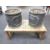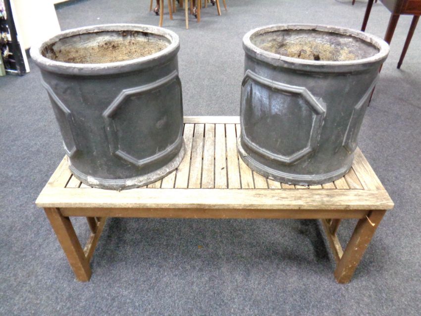 A pair of cylindrical garden planters together with teak garden low table and brass fire front