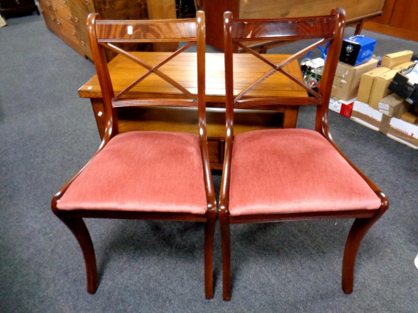 A Regency style mahogany twin pedestal dining table with leaf together with six chairs