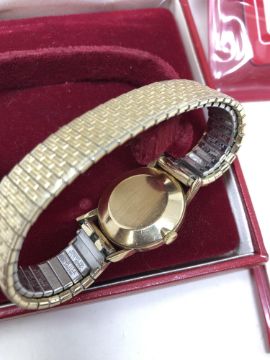 A Lady's 9ct Gold Omega Wristwatch, silvered dial with Arabic numerals, later crown, calibre 620 17 jewel manual-wind movement, case 23mm excluding crown, on associated gold-plated expanding strap, in Omega box.