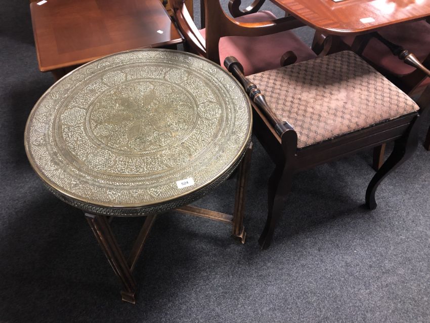 A circular Eastern folding brass topped table together with an Edwardian piano stool