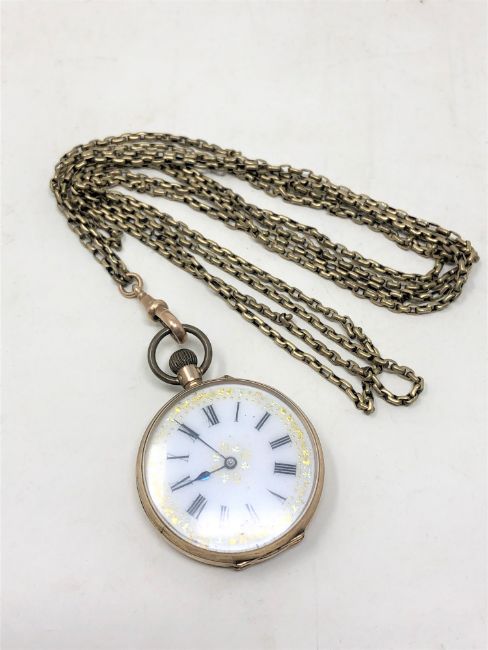 A 9ct gold open faced fob watch on plated chain
