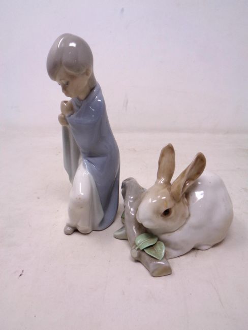 A Lladro figure of a girl in a blanket, together with a further Lladro rabbit figure