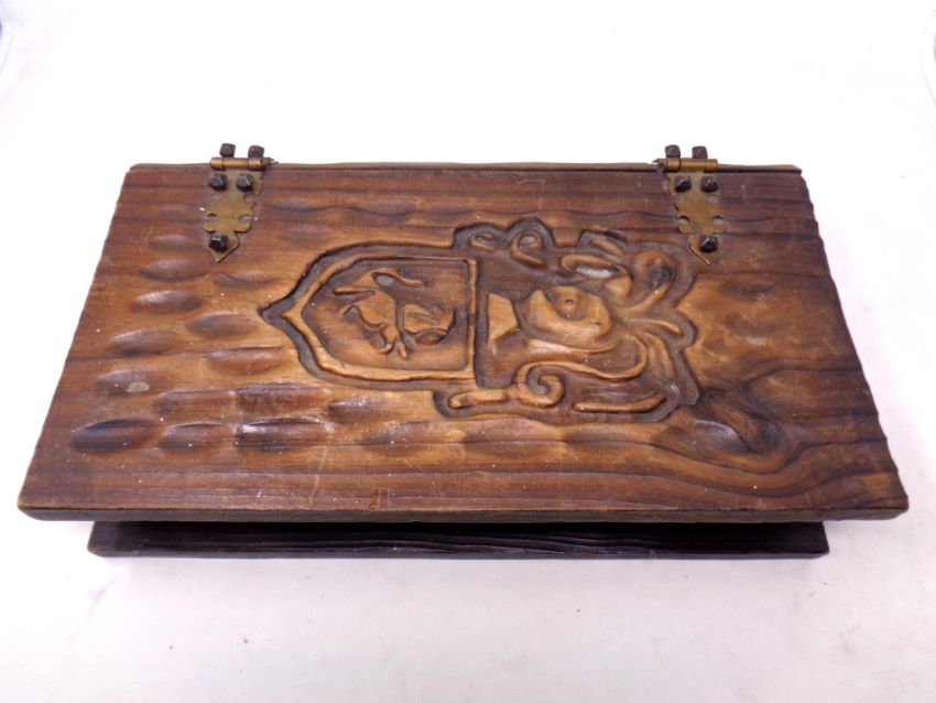 A wooden jewellery box in the form of a book containing a quantity of costume brooches