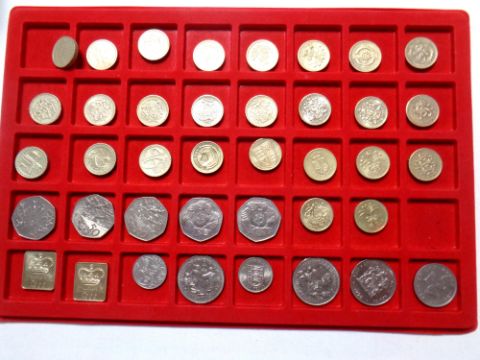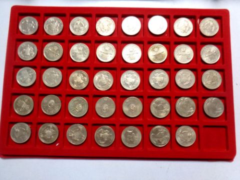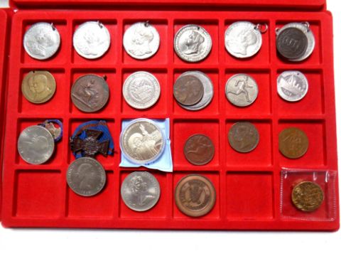 An aluminium coin collector's case containing four lift out trays containing commemorative coins, Victorian coronation medals, sports medal, commemorative coins, 50 pence, £2 coins etc