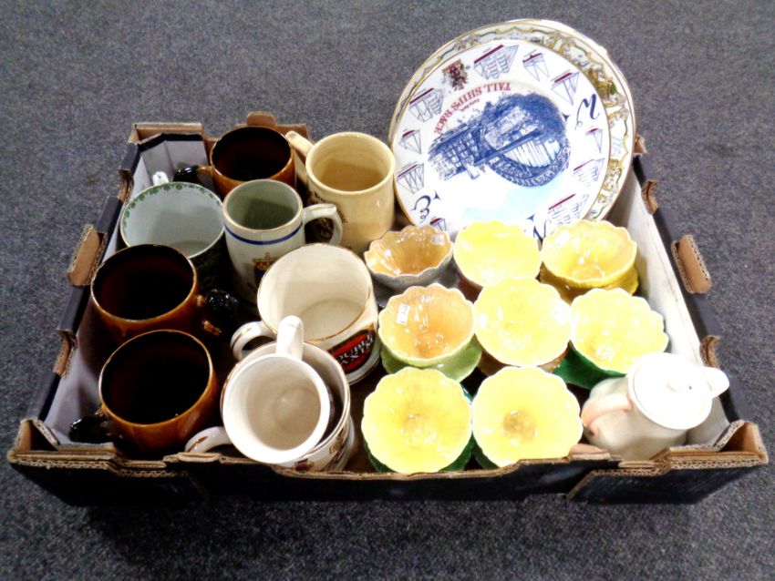A box of ceramics, Wade brewery tankards, wall plates, Art Deco coffee pot, Royal Winton lustre grapefruit dishes etc