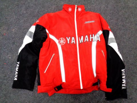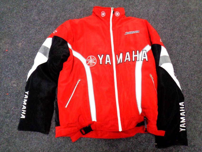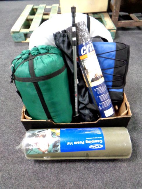 A box of camping equipment, pop-up tent, sleeping bag, walking poles, camping mat, Yamaha biker's jacket