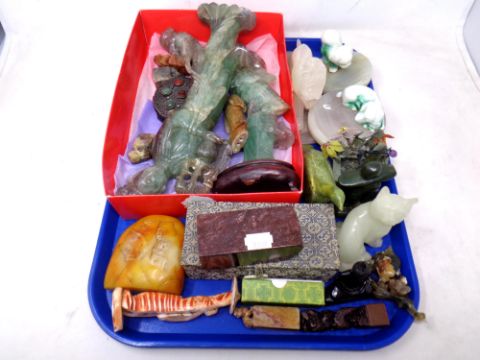 A tray of Chinese carved hardstone ornaments, soapstone figures, seals, filigree metal and stone trinket box