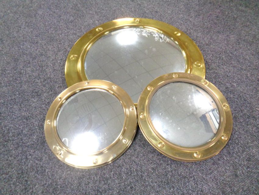 A circular brass porthole mirror, diameter 47 cm together with a similar smaller pair