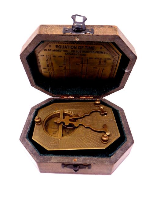 A reproduction F Cox of London brass sundial compass in fitted box.