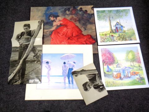 Franciso Rodriguez Sanchez Clement - Flamenco dancer print 25x20 inches, Catherine Stephenson - Carrot Van 15.5x15.5 and The Secret hut 15.5x15.5 inches, along with 4 James Dean 'Giant' vintage posters.