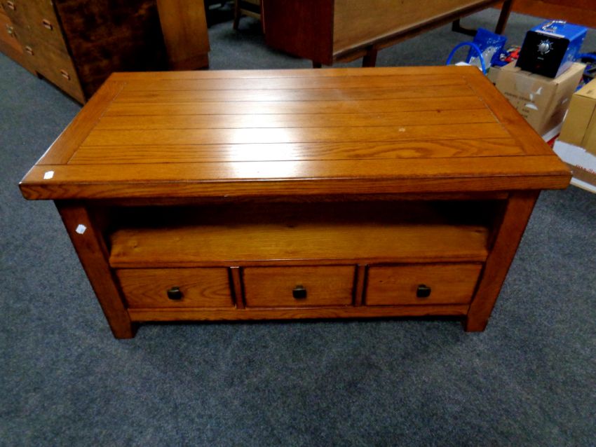 A Morris Furniture oak coffee table fitted with undershelf and three drawers