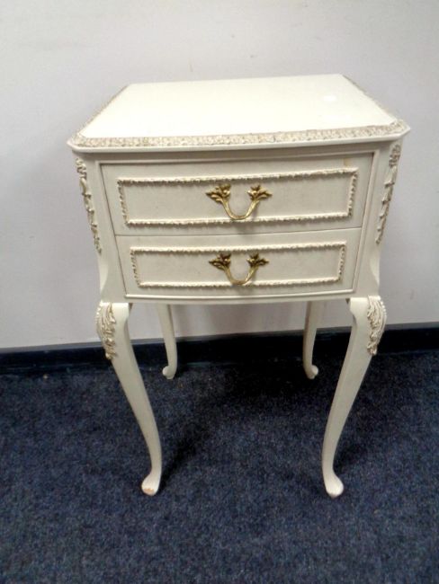 A cream and gilt two drawer bedside stand