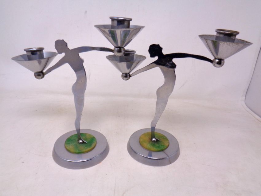 A pair of Art Deco style metal twin branch candelabra made in a munitions factory during WWII